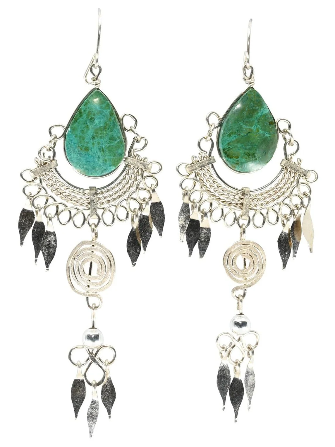 Eye-catching teardrop-shaped alpaca silver earrings add interest to your jewelry collection. Peruvian stone is embellished with a curlicue spiral on the bottom with dangling ornamentation. Approximately 2 inches in length. Hand-crafted in Peru.
