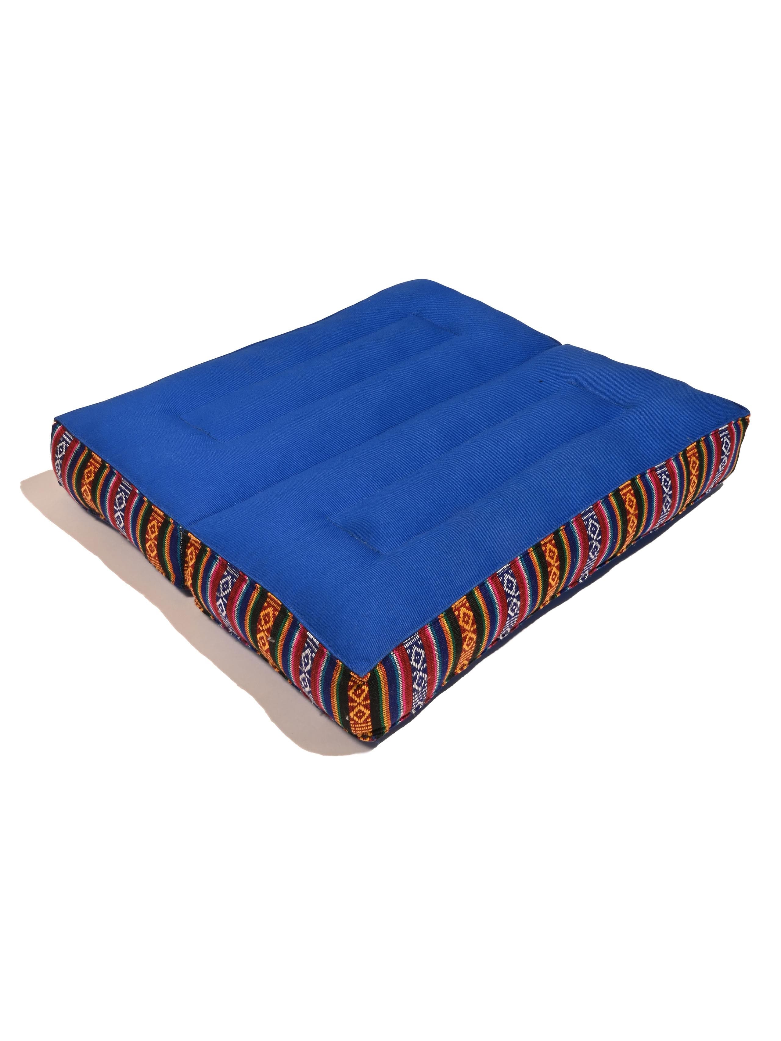 A foldable meditation cushion providing two kinds of support: Opened flat, it can be used as a square floor cushion. When folded, it is used to raise your hips when sitting in the lotus position for long periods. Sewn on cloth handle for ease of transporting. Smooth cotton fabric. Natural kapok fiber filling. Dimensions shown are for opened cushion. Choice of Colors. Color shades can vary. Made in Nepal.